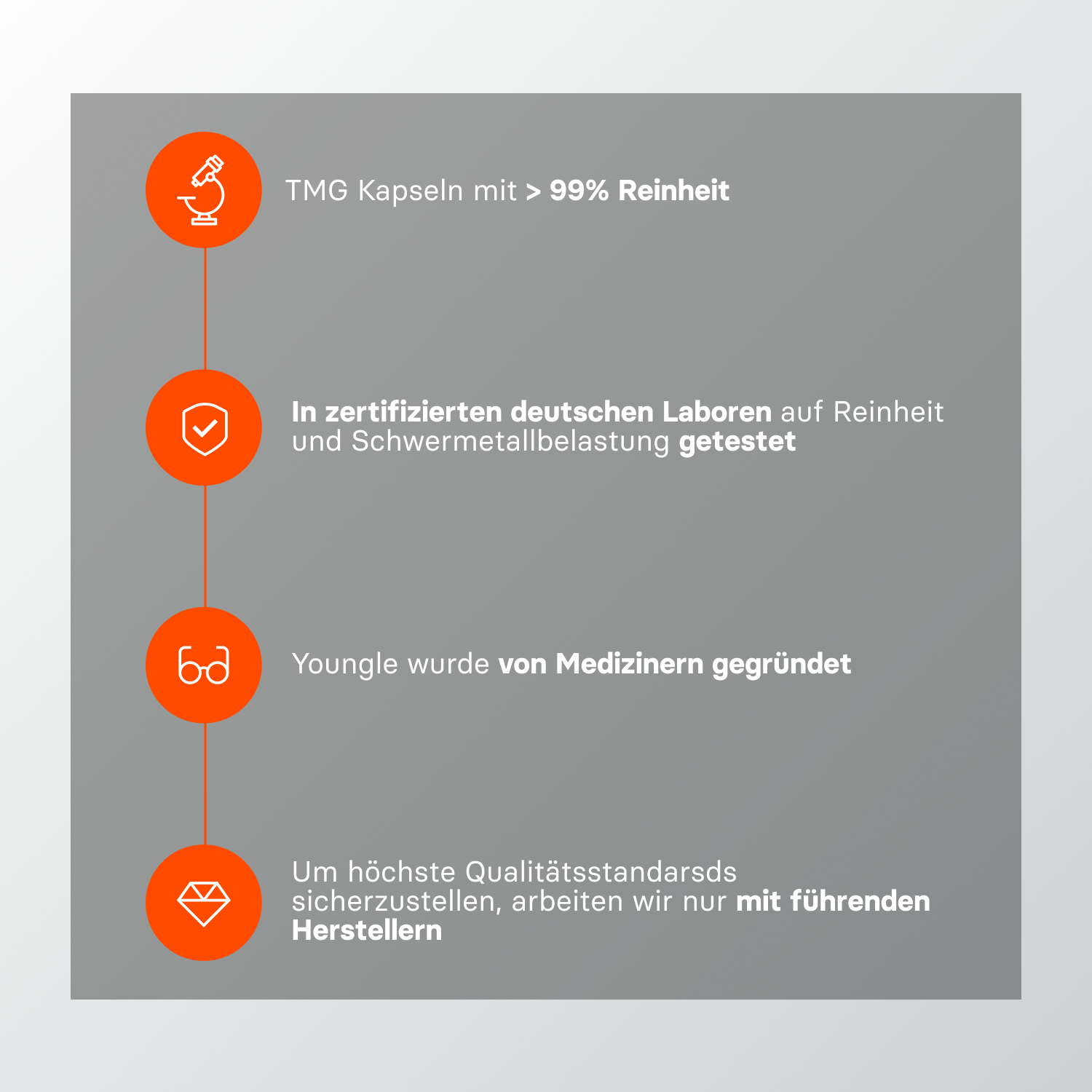 TMG despliega su efecto principalmente a largo plazo mediante el apoyo a los sistemas centrales de regulación en el metabolismo. Después de varios meses, no destaca un solo efecto, sino una base metabólica en general más estable. El acompañamiento continuo de los procesos de metilación contribuye a mantener la vitalidad y la capacidad de rendimiento a lo largo del tiempo.